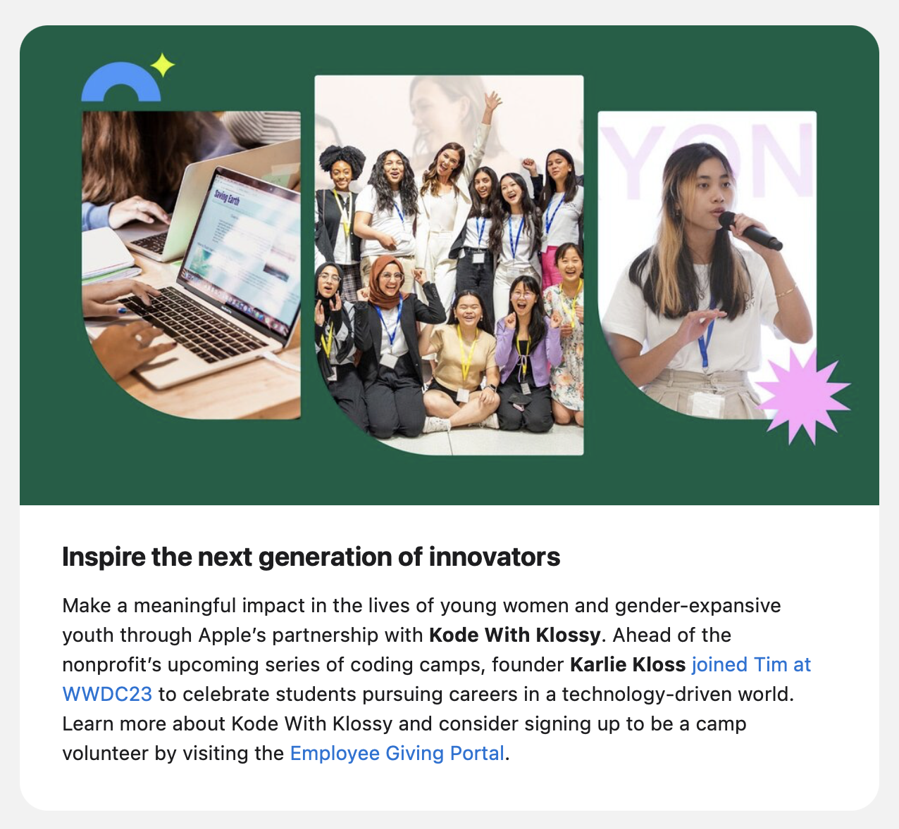 MY ROLE: Translate the Kode With Klossy experience into engaging branded content that tells the story of youth empowerment and STEAM education, reflecting Apple’s human-centered design approach.
