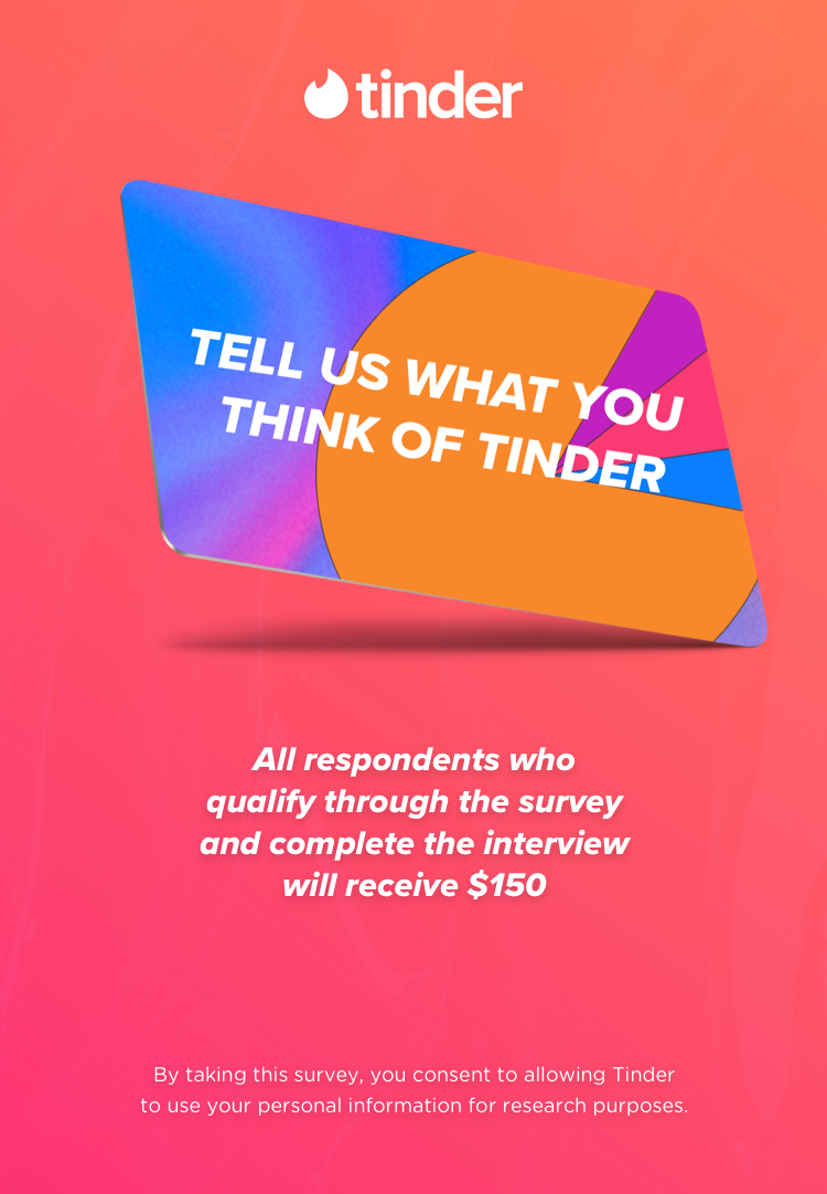 Tinder wanted to conduct an in-app survey for a User Motivation Study. The below designs helped in alerting members to the fact that they could qualify for a cash incentive which helped get traction in some harder-to-reach demographics (like 25+ female population) which was great. We were able to get all the survey respondents we needed (660 total completes in just 4 days) very quickly as we had a time-sensitive turn around for the βUser Motivation Studyβ.